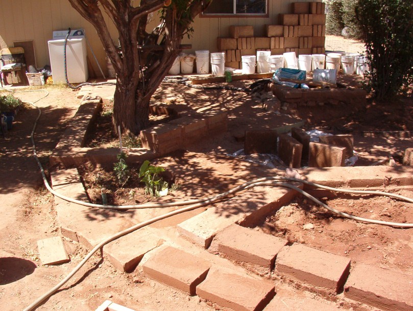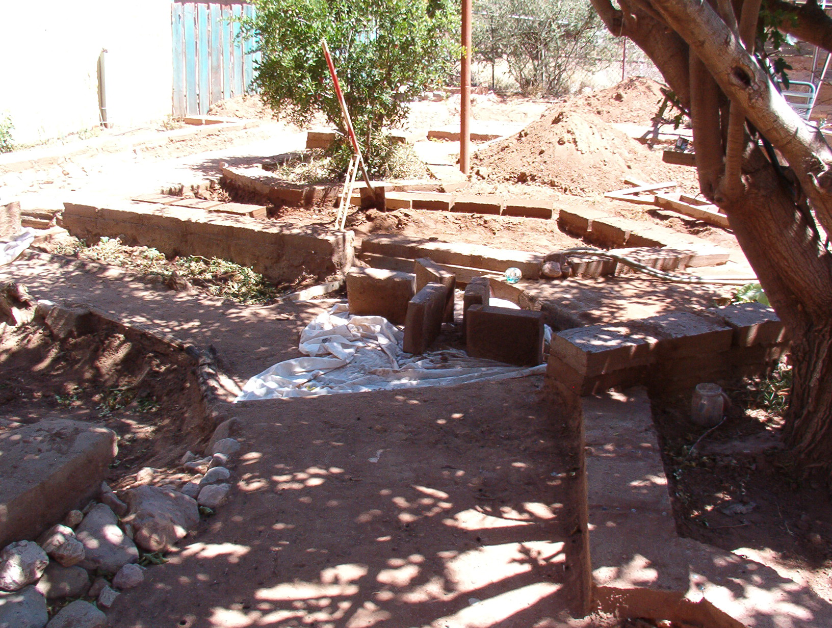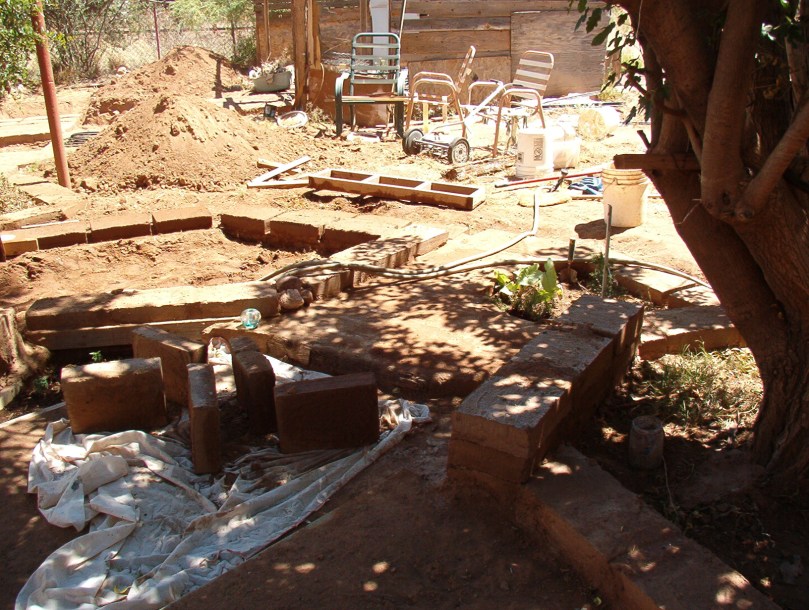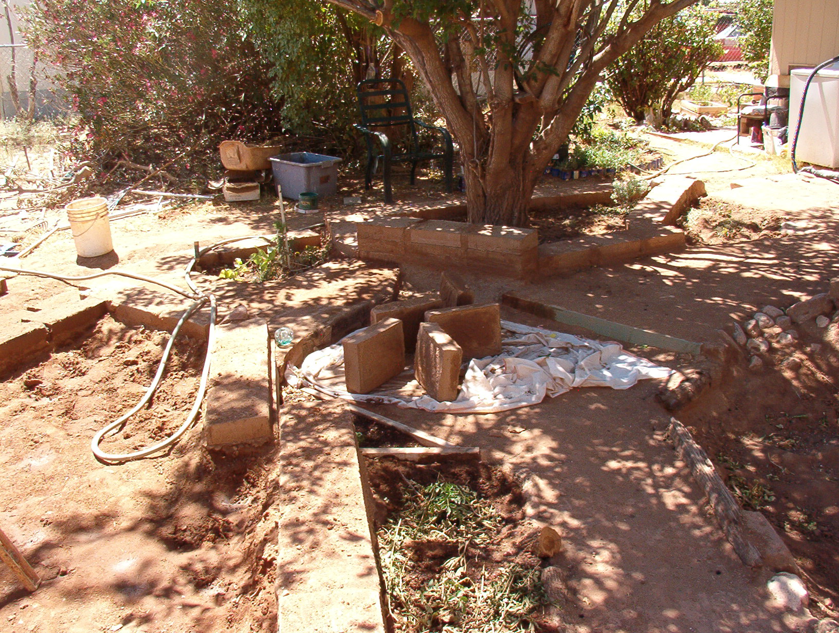 Short adobe wall around the Mulberry tree, probably the ONLY place I will allow Bermuda grass to thrive. In that triangle to the left are more tomatoes and two furrows of carrots! Two of the neighbor boys scampered over last week with their precious package of carrot seeds that their father had bought them. The seven-year-old planted 1/3 of the pack, rest to be planted later in the garden I am forming today after the rains come.Made some extra bricks yesterday, first in a long time I've had extra dirt, have to lay them down on cloth so they don't damage underlying walkway. Color is off on this one, that's the Pomegranate which also got its own little all around it yesterday, has mulch under it. To the left at lower corner will also be another contained garden. There are little glass half-marbles embedded in the adobe mortar between bricks on right.Another contained garden area 'growing' there to the left looking south. My poor chairs, were free, but plastic gets eaten by sun here and they have no bottoms! There by the tree I am making an adobe bench - far more durable when done!Tomatoes down there to the right of center wall, am working on next contained garden to the leftShovel and level are providing temporary stability to board-form for triangle joining blockLaying a single-block-wide stepping path down the center of next contained garden - good soil is too expensive and valuable to waste where footsteps pack the groundThere's a little cedar tree there in the small contained garden that my sister in Texas brought me. Hope is that it will continue to grow as the Mulberry dies and can replace it for shade - though not in my lifetime. Also planted two Stargazer lily bulbs in there yesterday ($4 each on sale!)