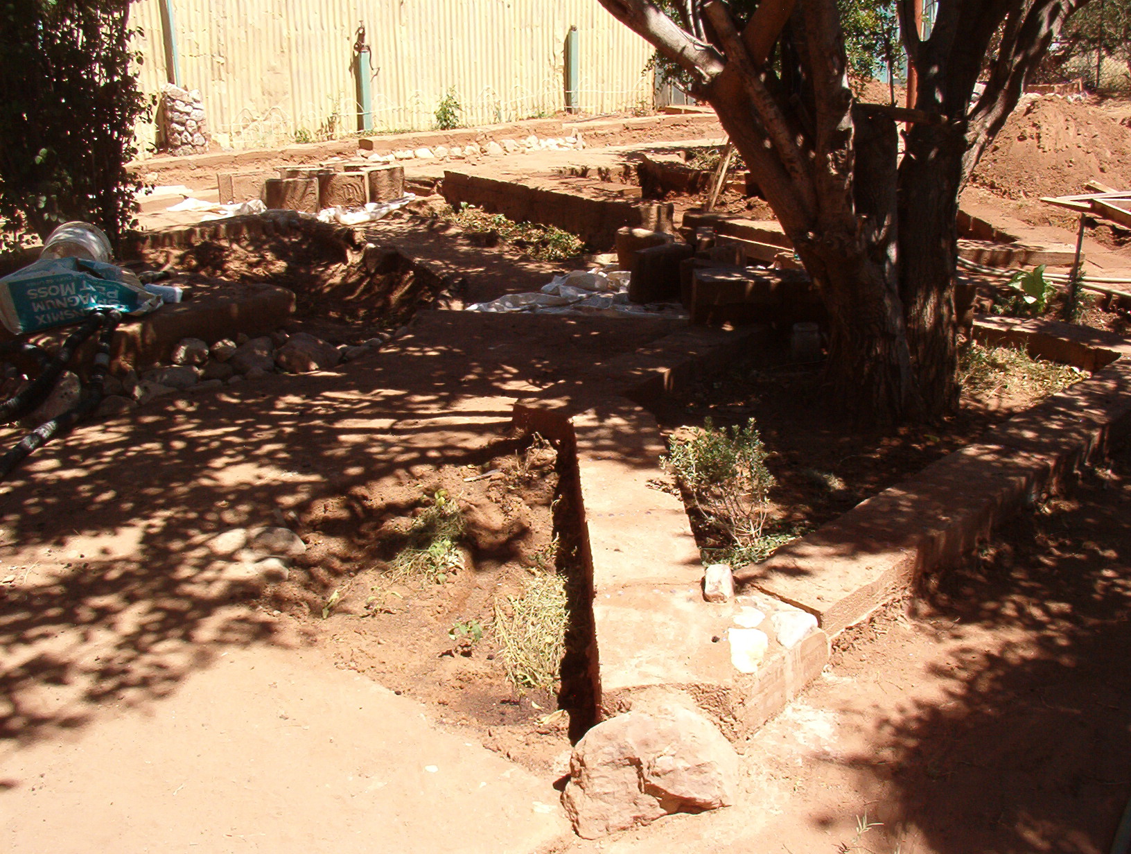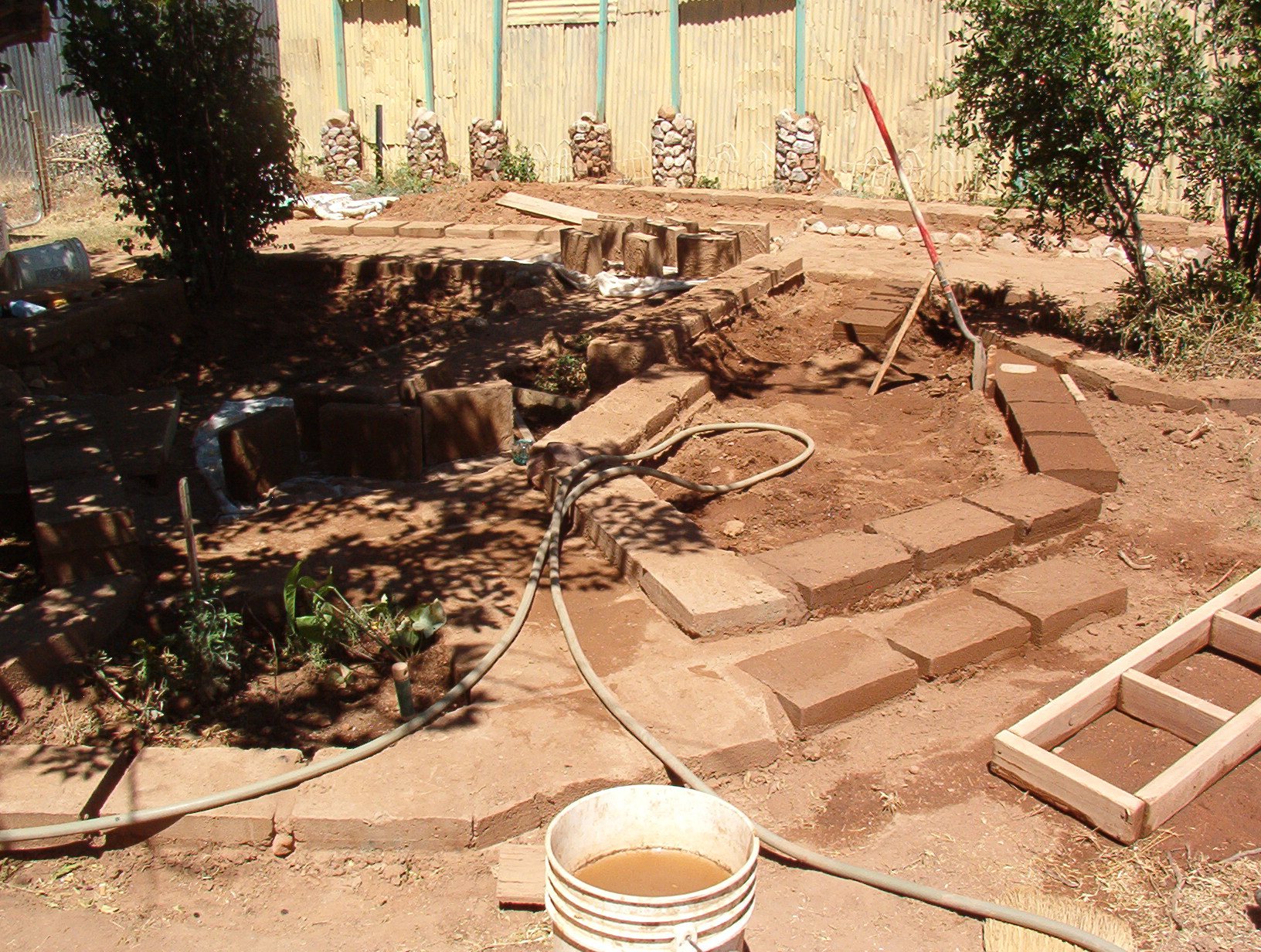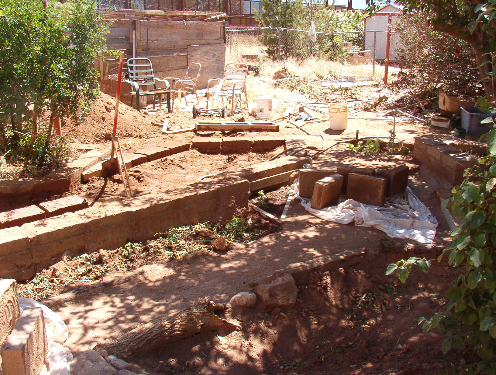 Short adobe wall around the Mulberry tree, probably the ONLY place I will allow Bermuda grass to thrive. In that triangle to the left are more tomatoes and two furrows of carrots! Two of the neighbor boys scampered over last week with their precious package of carrot seeds that their father had bought them. The seven-year-old planted 1/3 of the pack, rest to be planted later in the garden I am forming today after the rains come.Made some extra bricks yesterday, first in a long time I've had extra dirt, have to lay them down on cloth so they don't damage underlying walkway. Color is off on this one, that's the Pomegranate which also got its own little all around it yesterday, has mulch under it. To the left at lower corner will also be another contained garden. There are little glass half-marbles embedded in the adobe mortar between bricks on right.Another contained garden area 'growing' there to the left looking south. My poor chairs, were free, but plastic gets eaten by sun here and they have no bottoms! There by the tree I am making an adobe bench - far more durable when done!Tomatoes down there to the right of center wall, am working on next contained garden to the leftShovel and level are providing temporary stability to board-form for triangle joining blockLaying a single-block-wide stepping path down the center of next contained garden - good soil is too expensive and valuable to waste where footsteps pack the groundThere's a little cedar tree there in the small contained garden that my sister in Texas brought me. Hope is that it will continue to grow as the Mulberry dies and can replace it for shade - though not in my lifetime. Also planted two Stargazer lily bulbs in there yesterday ($4 each on sale!)