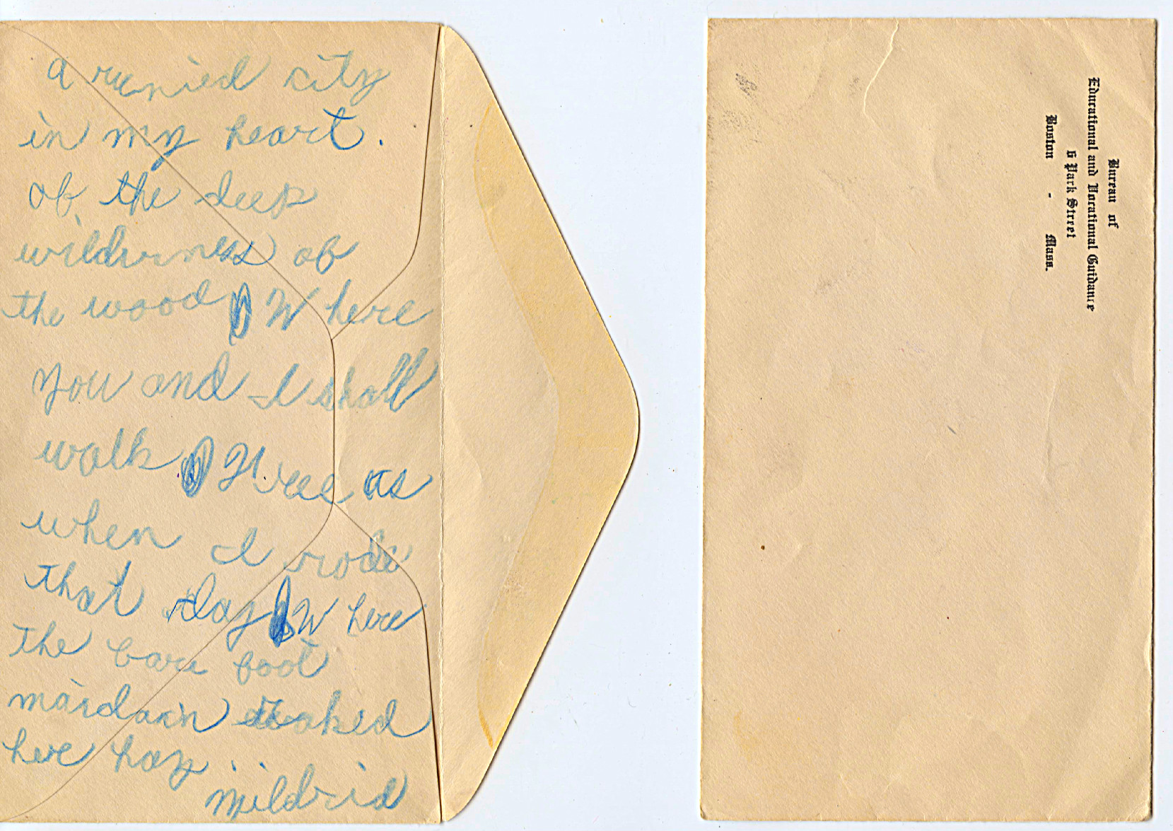 In with my mother’s mother’s college graduation information from Boston University 1917 and masters graduation transcript and information for the University of Minnesota in 1918 I found two very old regular size envelopes with ‘Bureau of Educational and Vocational Guidance, 6 Park Street, Boston, Mass. printed on them. Neither envelope was ever mailed or addressed – but here is what is written in my mother’s child handwriting – evidently before she even knew how to spell her own name (I am going to correct the spelling here in this text):