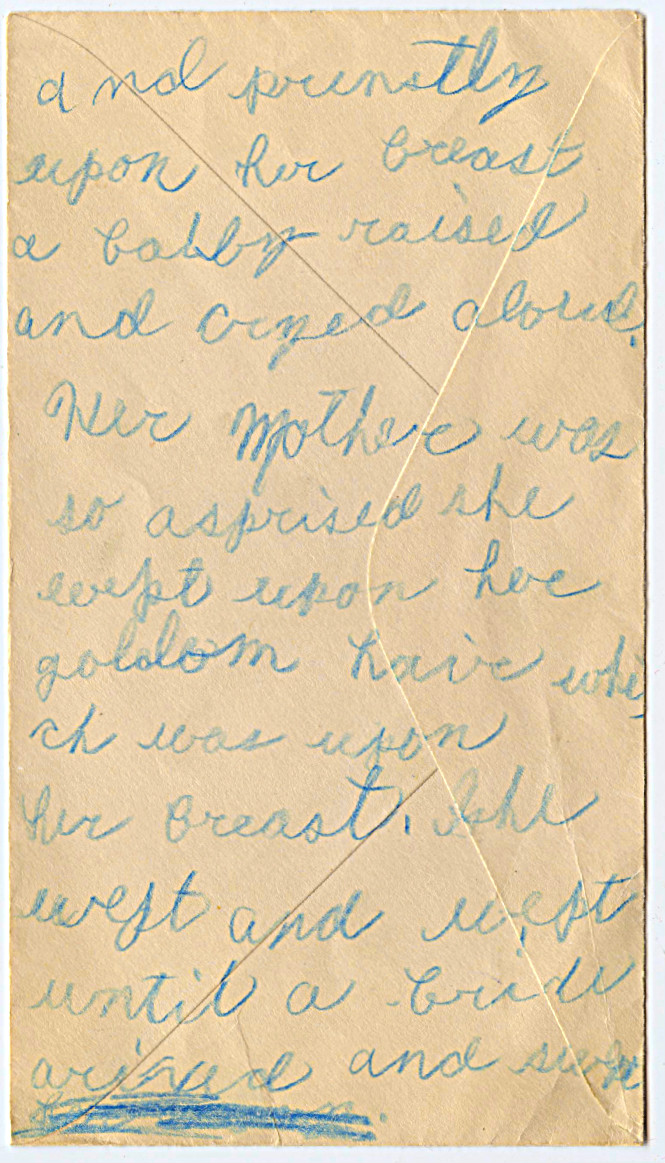 This looks about like an age eight handwriting – even then the seeds of how my mother’s life turned out had certainly already been planted within her beginning with not having her needs met from infancy forward. The loss of her grandfather, of her father, and the loss of her mother when her mother went to work to support her family once she had divorced when my mother was five.