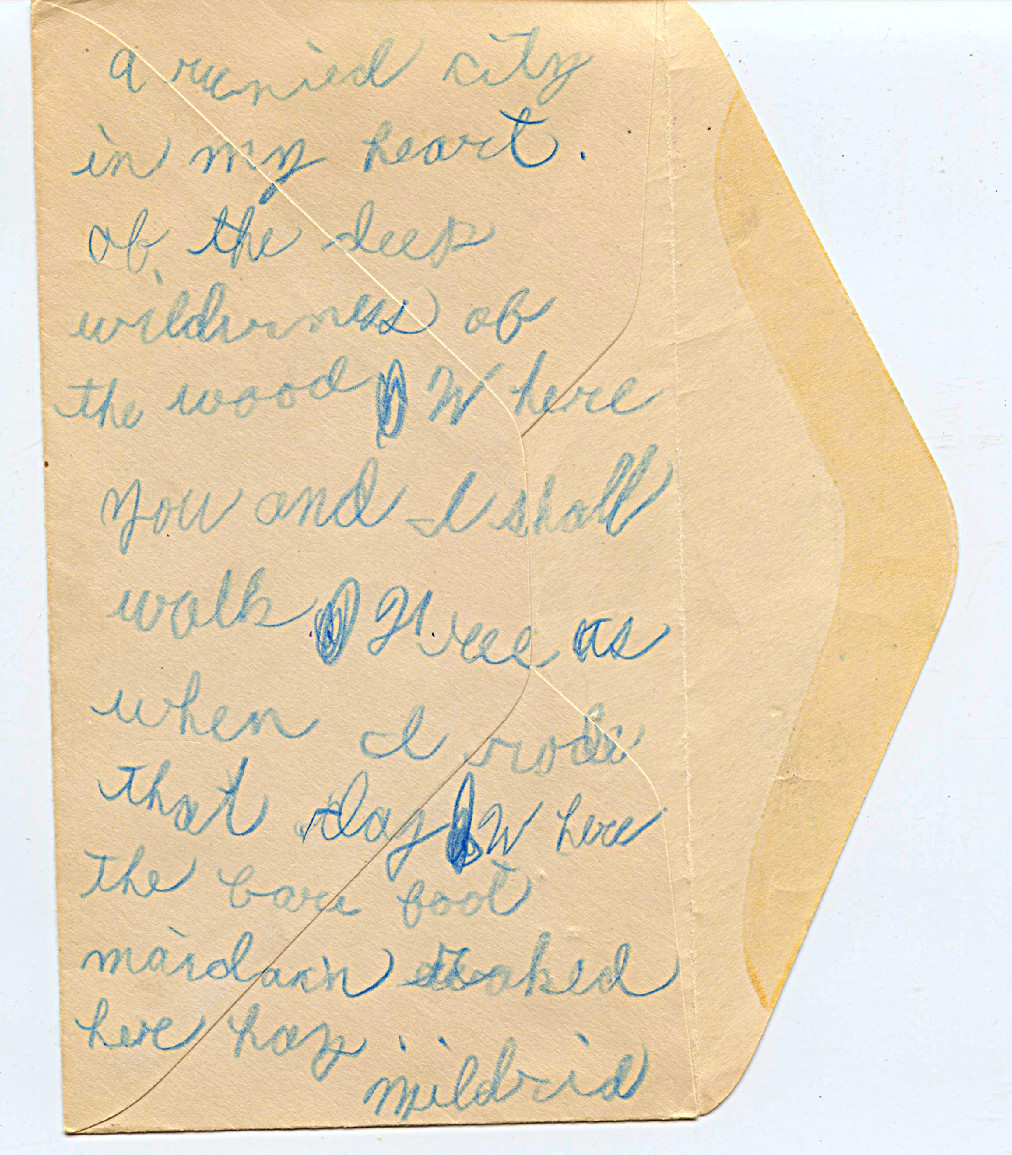 How would it happen that a child this young would understand the meaning of these phrases, “a ruined city in my heart” and “the deep wilderness of the wood where you and I shall walk free?” I wonder. I have to deeply wonder.