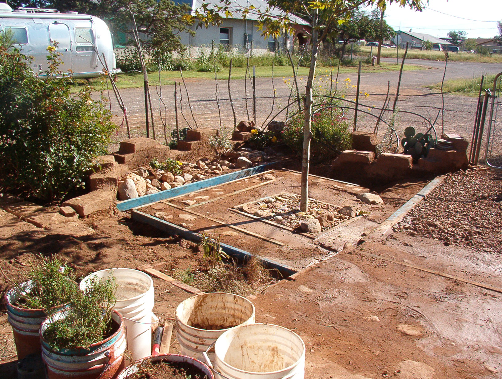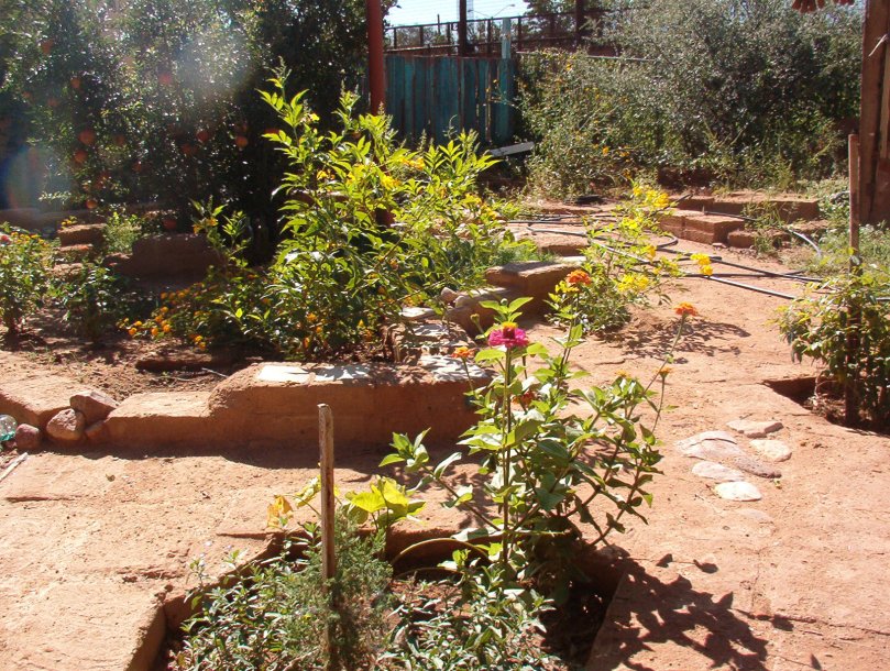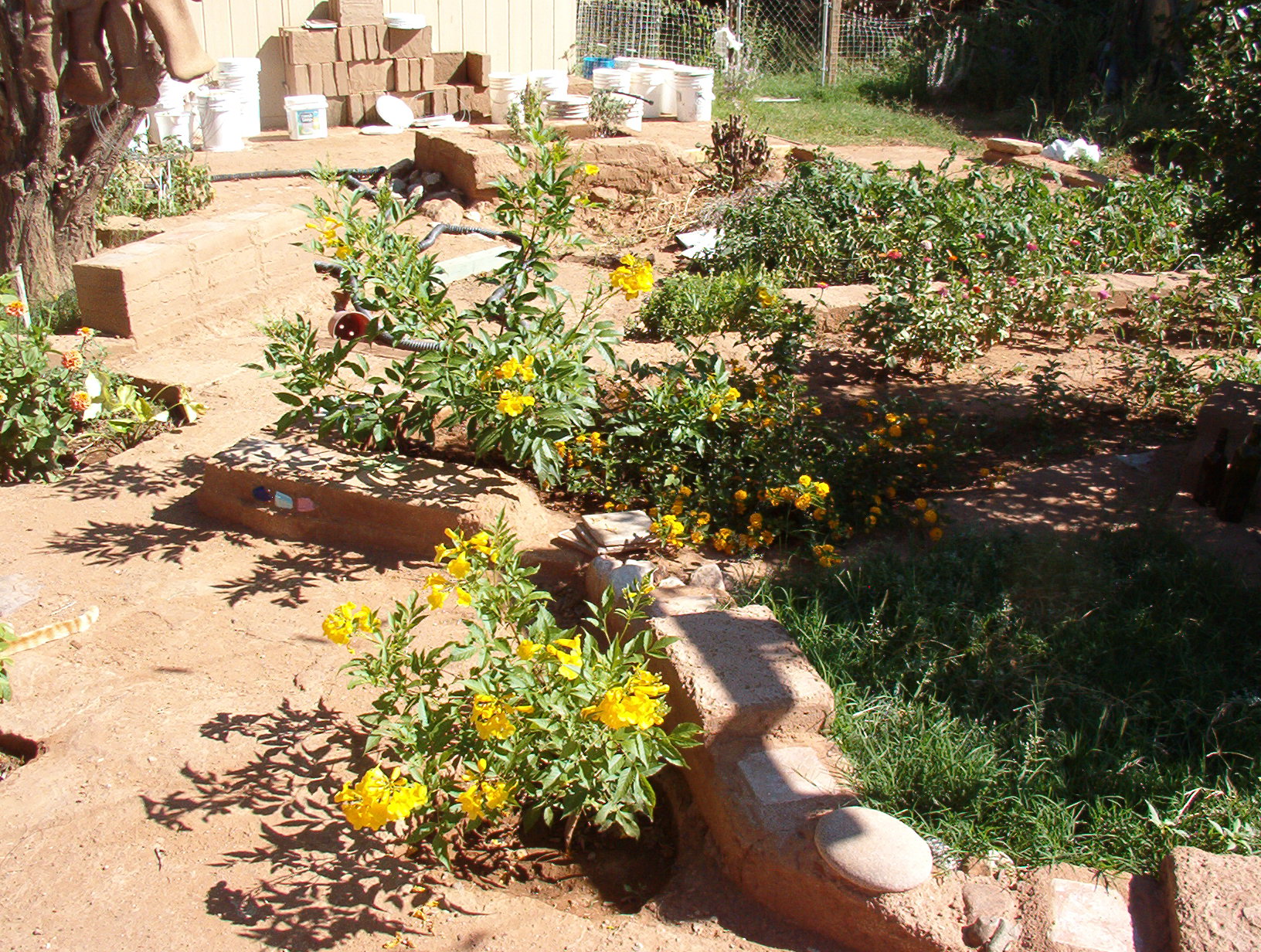 My little wall around the perimeter is made from the adobes I showed pictures of last summer stored against the wall of my house. They are too sandy and fragile to use to carry much weight, but are perfect — again — for a Bermuda defense wall. There is creeping Bermuda outside my fence, but hopefully I can catch its nasty little runners as they come OVER the top of my little wall before they can take root on my GOOD side of the fence.