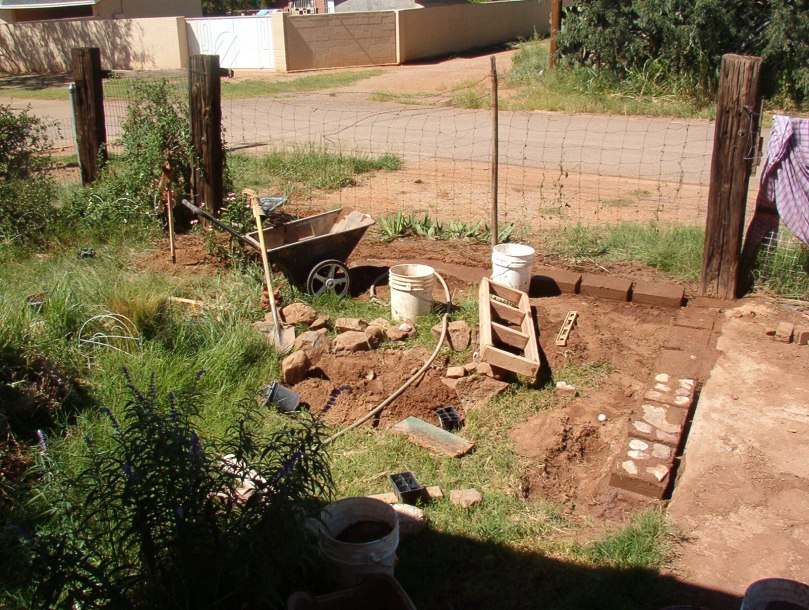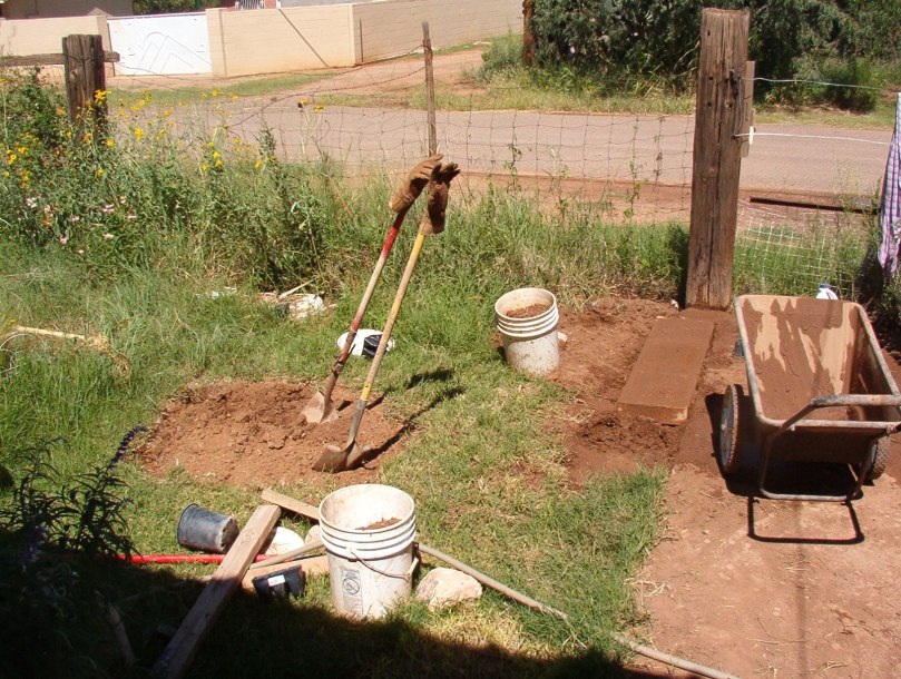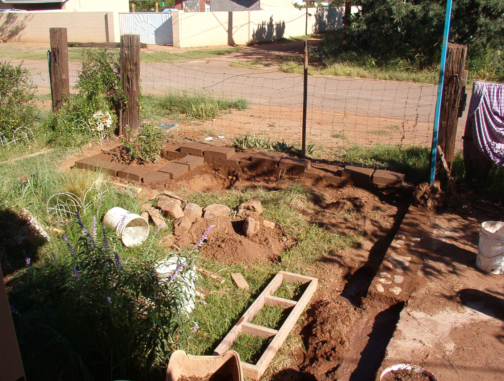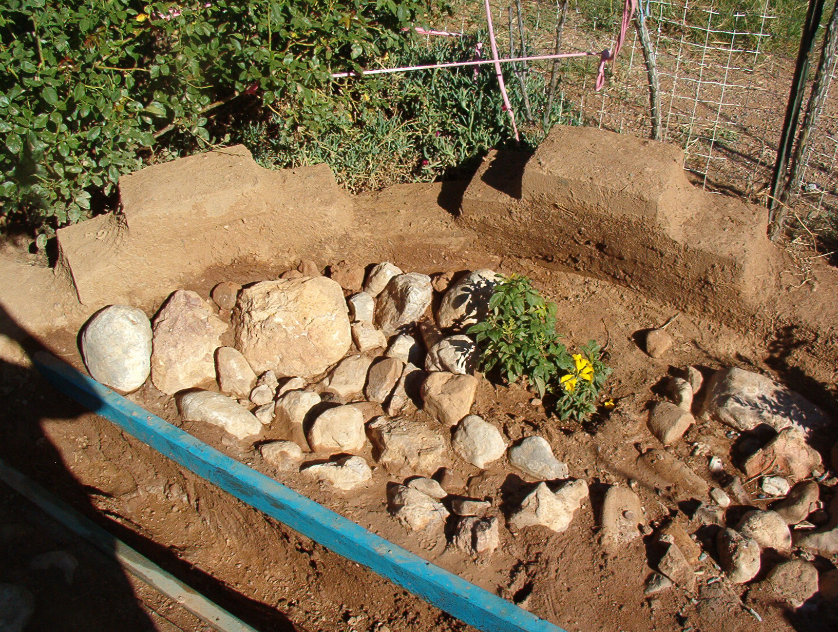 My little wall around the perimeter is made from the adobes I showed pictures of last summer stored against the wall of my house. They are too sandy and fragile to use to carry much weight, but are perfect — again — for a Bermuda defense wall. There is creeping Bermuda outside my fence, but hopefully I can catch its nasty little runners as they come OVER the top of my little wall before they can take root on my GOOD side of the fence.