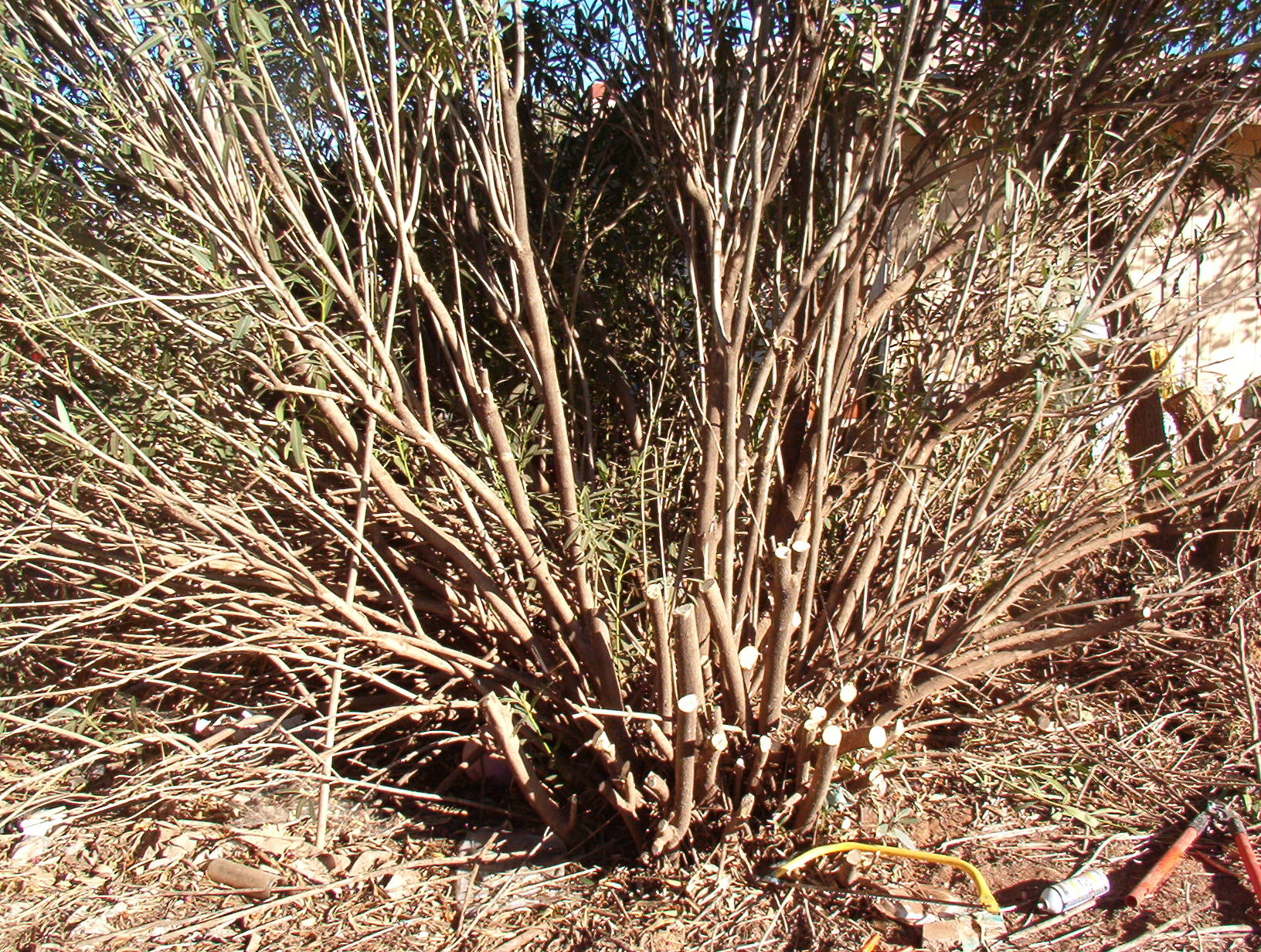 There are two oleander plants in this mess. This one on the south side is the pink bloomer. As I eliminate the growth of this one, I can begin to see the separate clump that is the white bloomer to the north of this one.