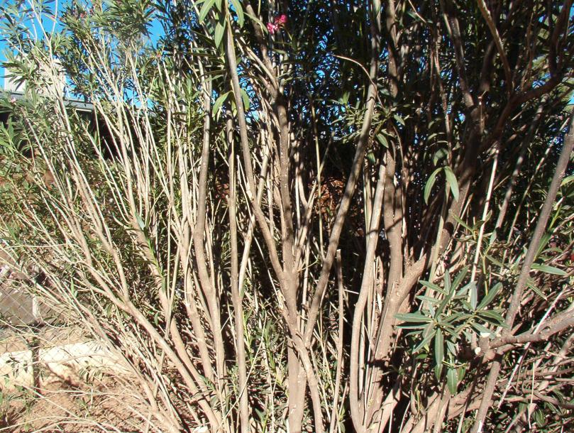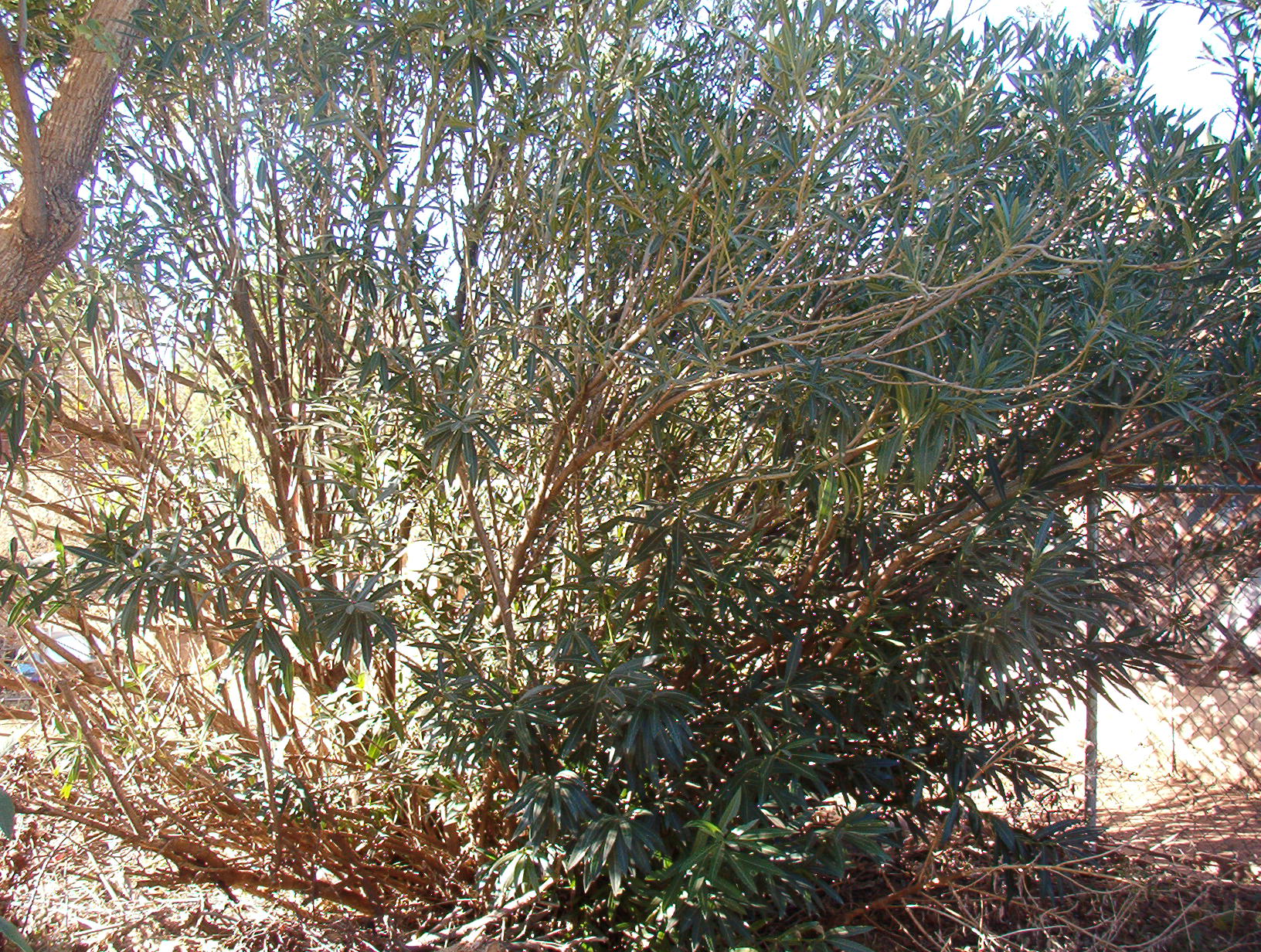 NOTE: I just discovered something else out about the oleander. I found a branch lying so low that it grew horizontally out of the main root. Its tip ended up on the ground and grew into the soil along my neighbor’s fence line. Where it did this another oleander was formed!
