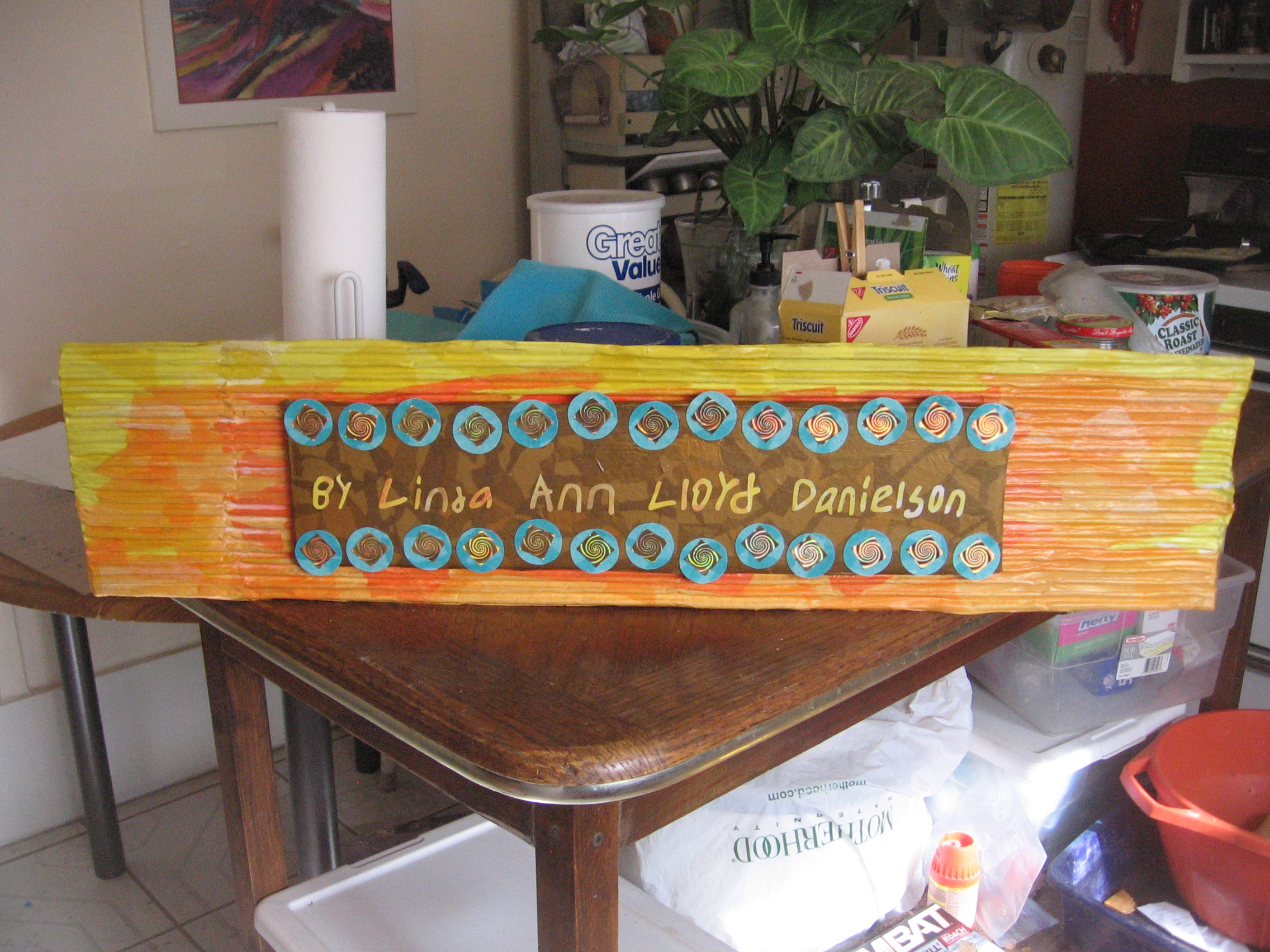 I hired a 10-year-old boy to print out the lettering for me. He was SO PROUD! He even walked differently with his triumph showing after he finished his task – on lined notebook paper. I brought his words to an office supply store for enlarging, used brush strokes from a De Grazia calendar for the coloring….