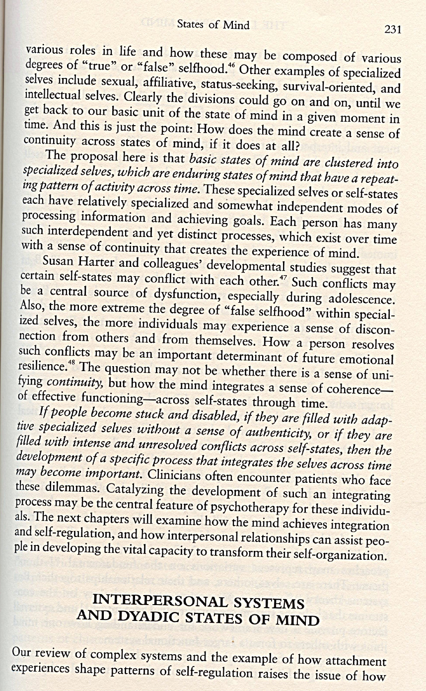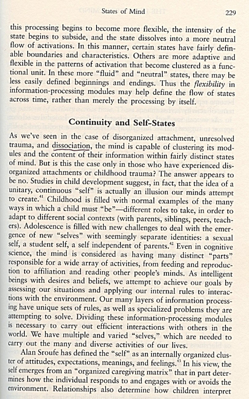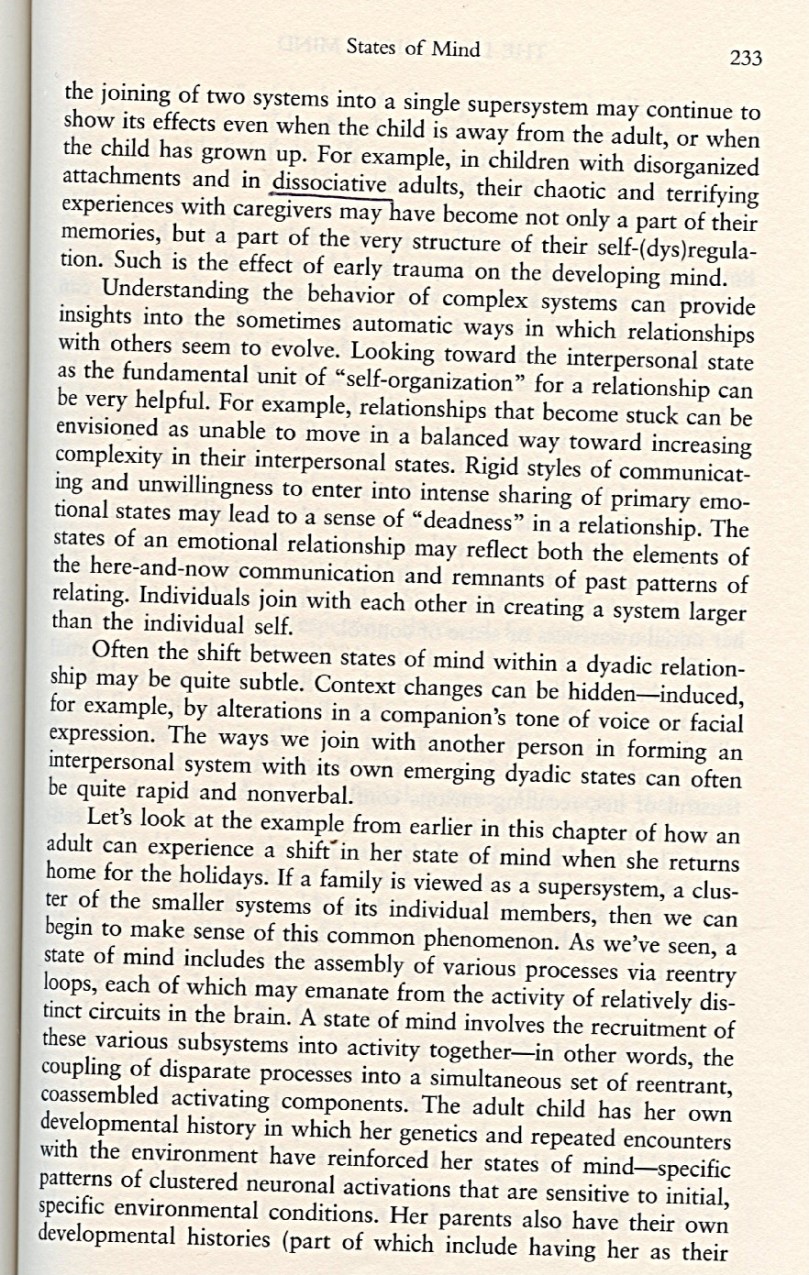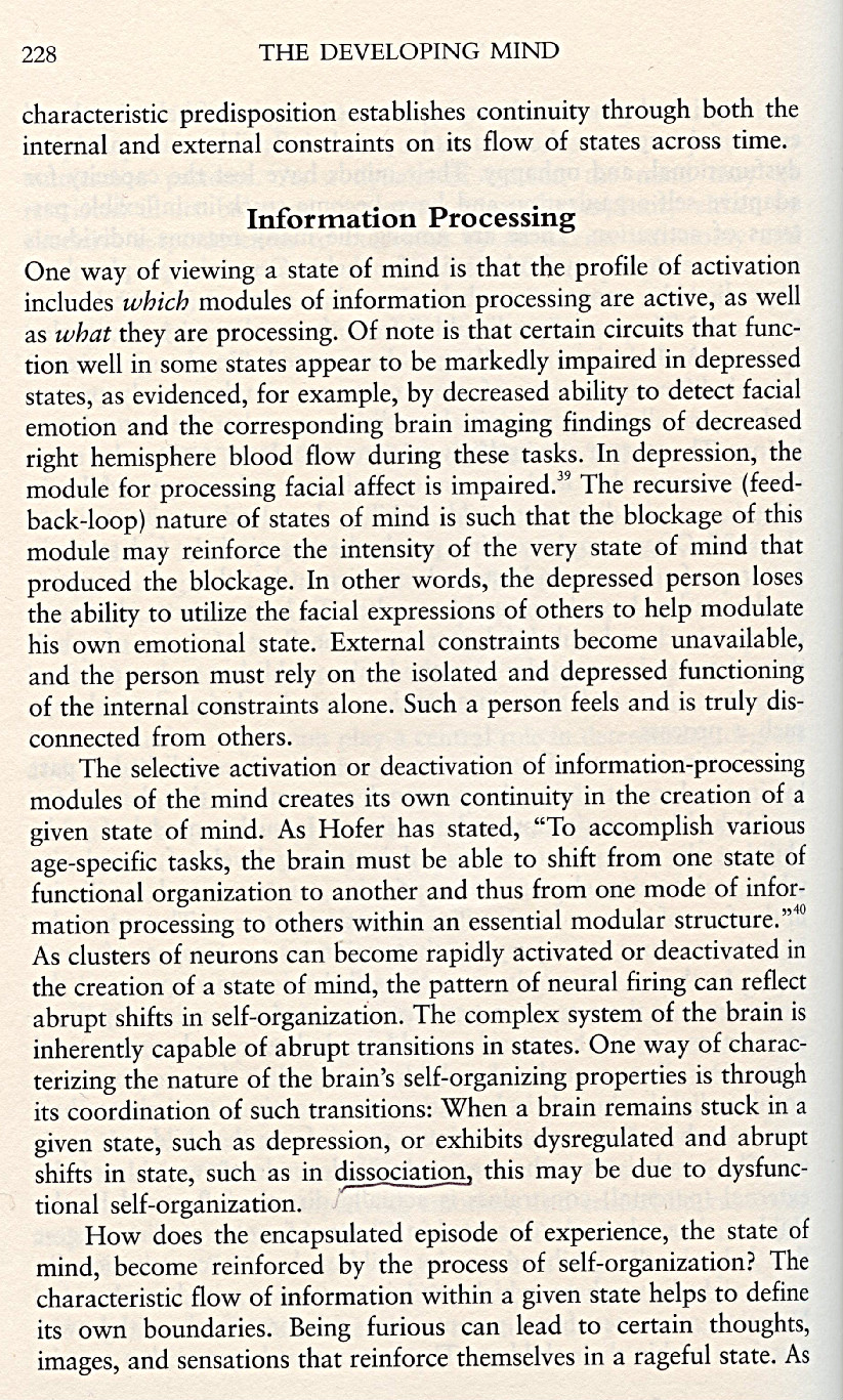 The following has been scanned for educational purposes only from Dr. Daniel Siegel’s book, The Developing Mind: How Relationships and the Brain Interact to Shape Who We Are (2001). I know this is primitive, but hopefully you can read these pages! The material is complex, but for those of us who were severely abused and traumatized throughout infant-childhoods, this information describes how our ‘self’ was impacted in our development and affects our experience now. (Connected to this post: +THINKING MORE THOUGHTS ABOUT THINKING)