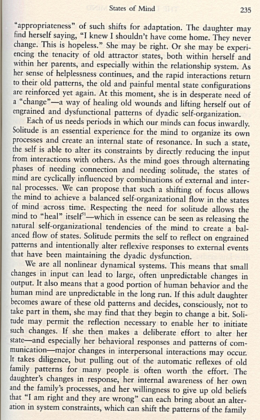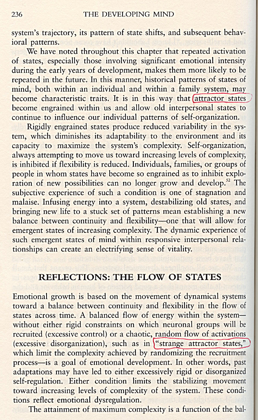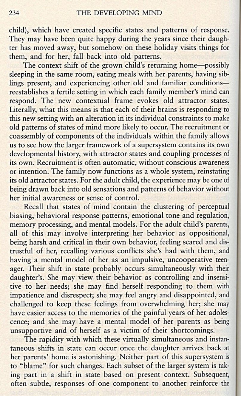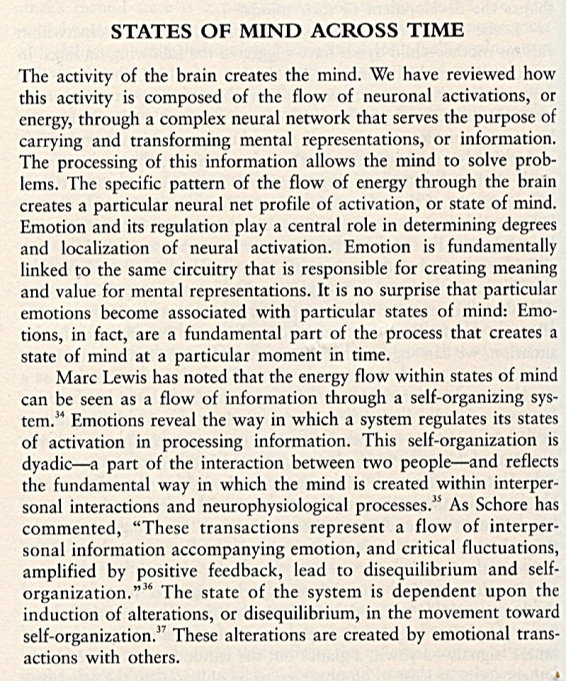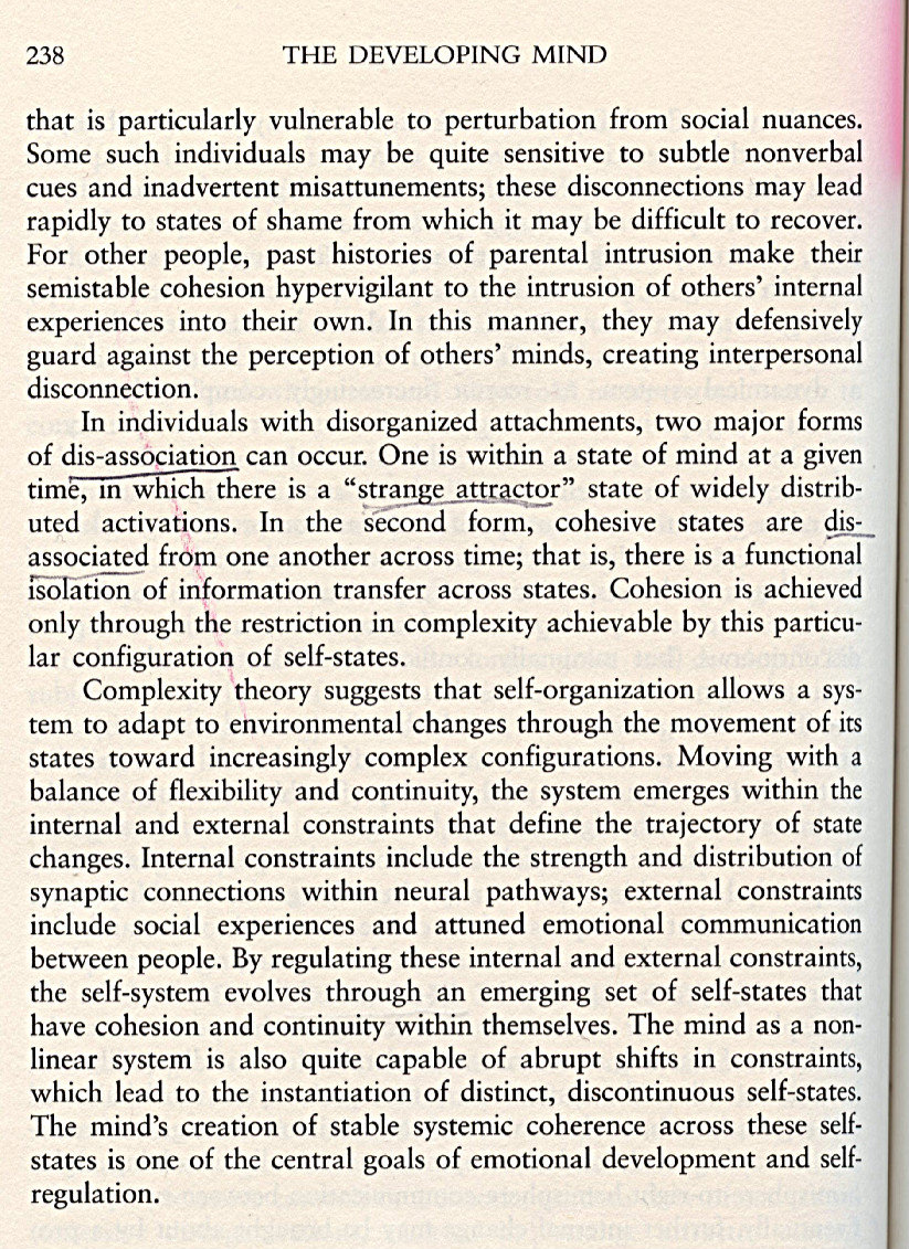 The following has been scanned for educational purposes only from Dr. Daniel Siegel’s book, The Developing Mind: How Relationships and the Brain Interact to Shape Who We Are (2001). I know this is primitive, but hopefully you can read these pages! The material is complex, but for those of us who were severely abused and traumatized throughout infant-childhoods, this information describes how our ‘self’ was impacted in our development and affects our experience now. (Connected to this post: +THINKING MORE THOUGHTS ABOUT THINKING)