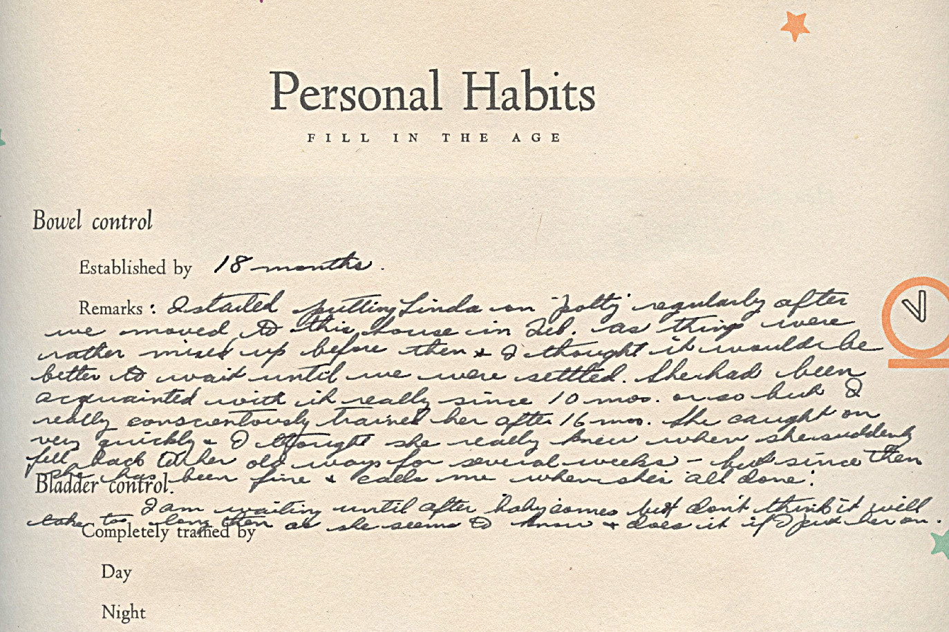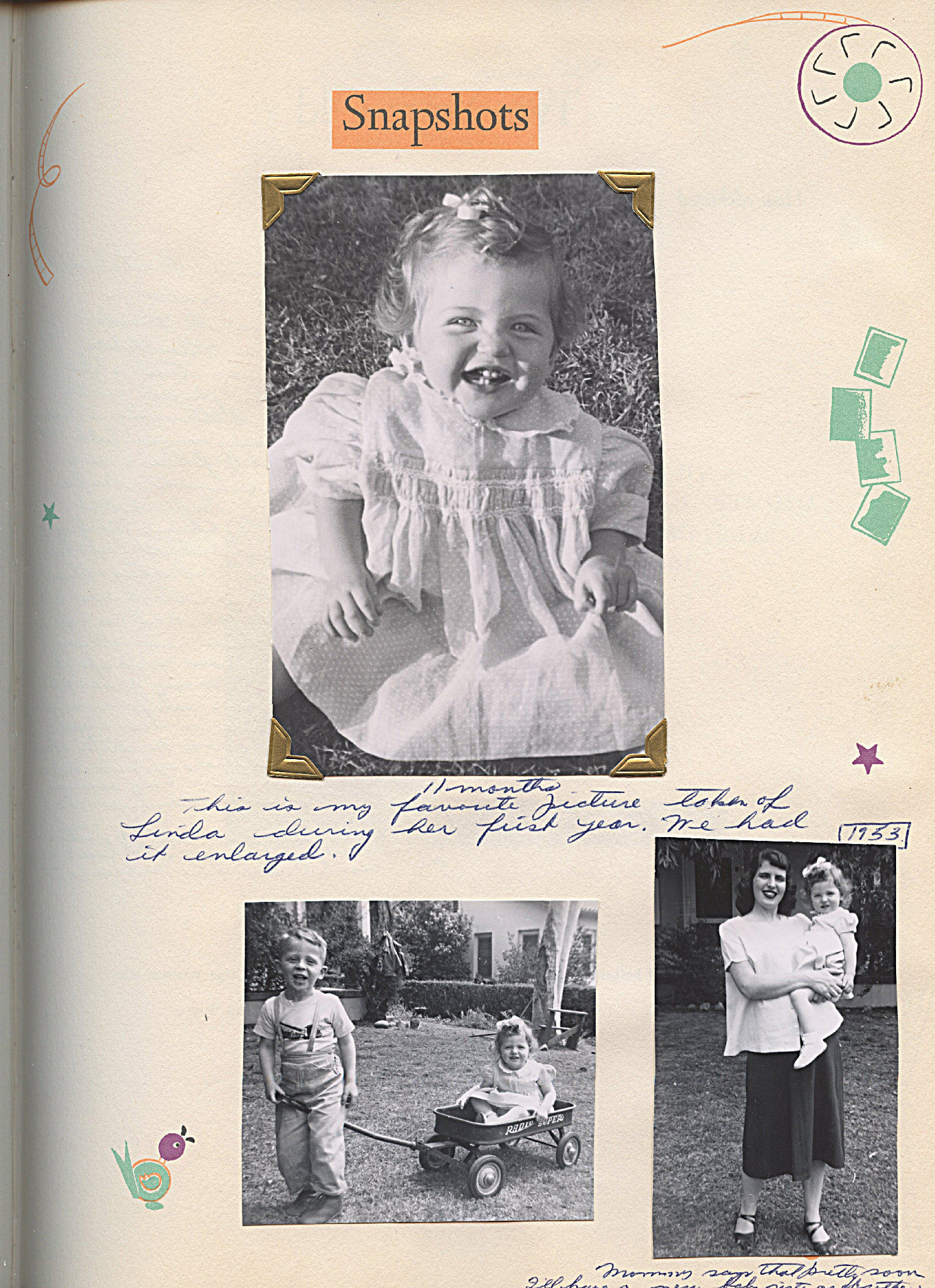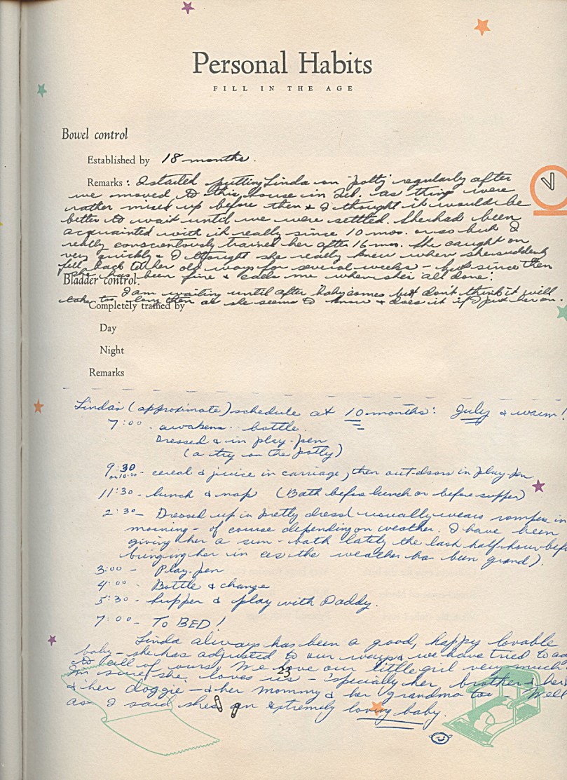 In her June and July 1957 letters to my father my mother mentions the 'masks' - Mildred wore a mask the best she could as she wrote in this book. I know all was not charming as she began to toilet train me at ten months of age. Not by a long shot. Here Mother also writes my 10-month schedule, which would appear to be one a perfect mother might create for her baby. But when I open the covers of this book I hear her screaming at me. I see the rage in her strangely changed eyes. And I sense it in my mother's words written at the bottom of this page: "Linda always has been a good, happy lovable baby -- she has adjusted to our ways and we have tried to adjust to all of ours - no doubt she meant 'hers' but wrote 'ours And on this page: We love our little girl very much and I'm sure she loves us - 'specially her brother -- her Da-Da and 'her doggie' -- and her Mommy and her grandma too. Well, as I said she's an extremely loving baby - underlined with a little smiley face drawn