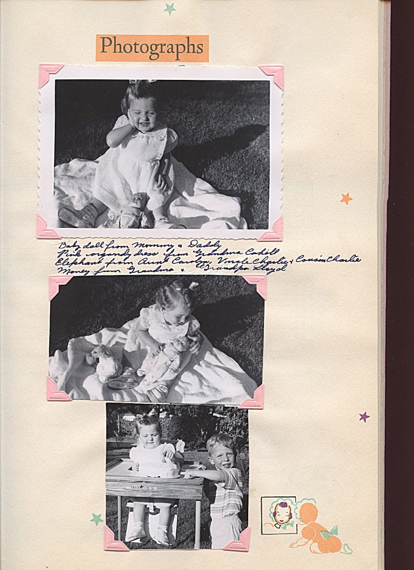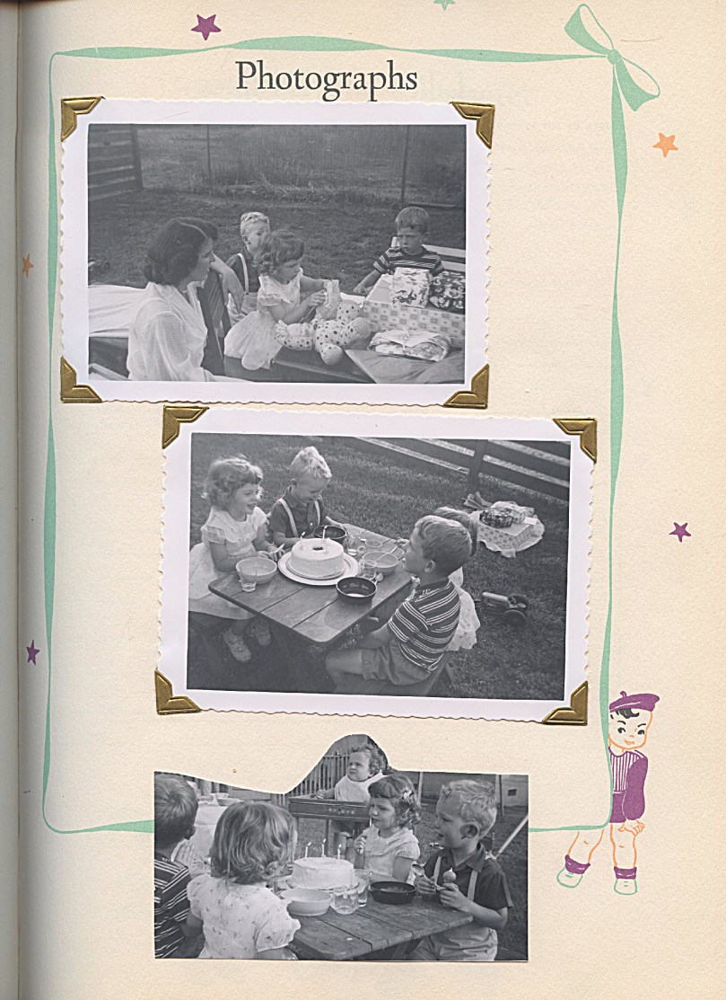 Again my secnod birthday, Cindy a newborn, John age three - I believe at the third house we lived in after my birth. Now, after this, the trouble must have seriously begun where my mother could no longer keep her mask on. There are pages following this one that are ripped from the book and gone forever. Yes, there still is a lock of my age two hair in that little envelope.