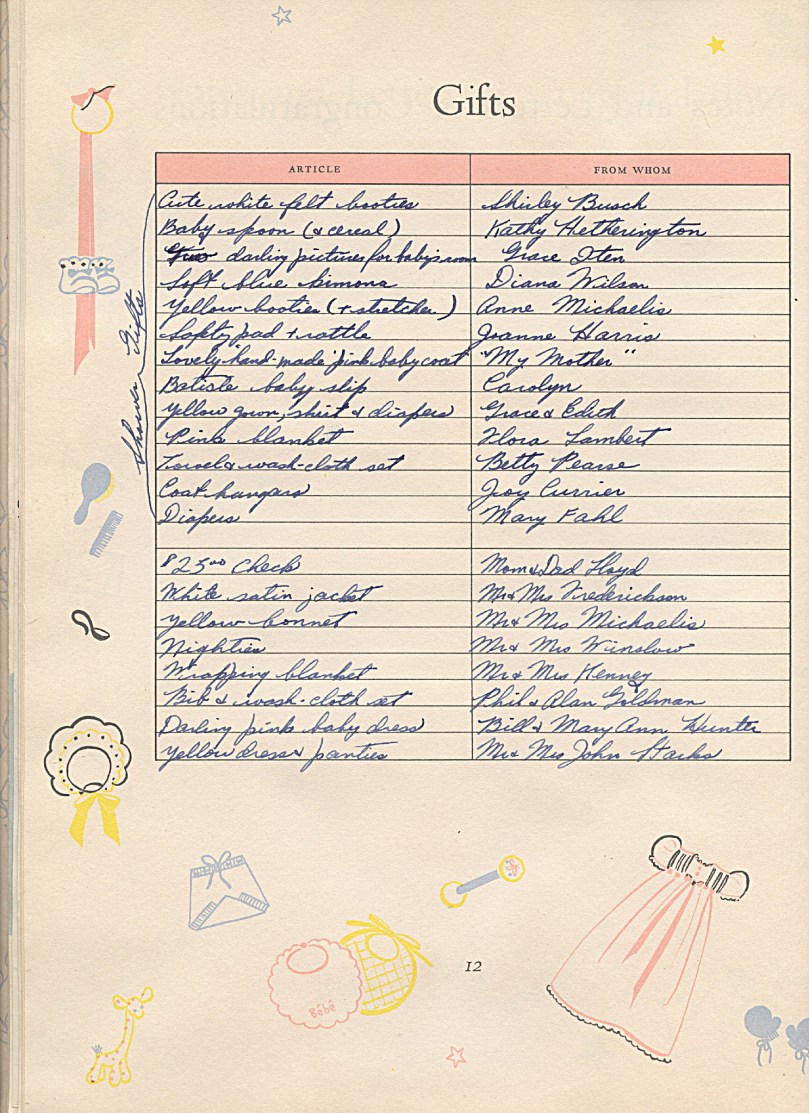 A list of shower and baby gifts. What strikes me as troubled and strange (with my hyper-what's-wrong-with-Mildred senses) is that "My Mother" has both words capitalized with quotation marks. In the little book I found with the actual b & w negatives from this era, that contains the list of titles that go with them, my mother used that same format not when she wrote - carrying John - but when she wrote "carrying Linda" - same quotations marks - the invisible something that connects me with my mother's experience with her mother.