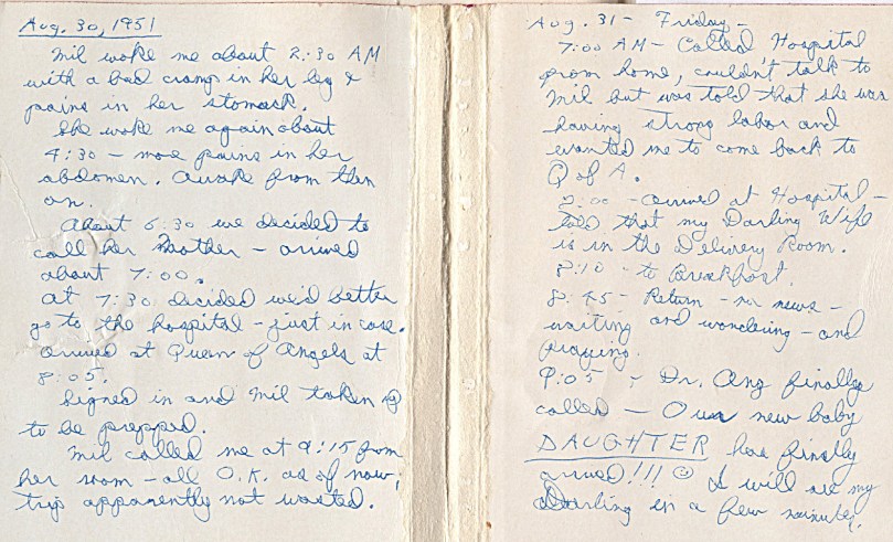 These are the notes my father wrote on the inside covers of what was a slim Western, 'Bugles in the Afternoon' by Ernest Haycock. It feels so strange to me to read his words and realize that within the span of time he covers here something terrible, terrible, terrible happened to my mother's mind while she was in labor with breach-birth me. I weighed 8 pounds 2 ounces when born, a normal size infant. The problem was that this Catholic hospital banned my father from my mother's side, and back then there was no C-section for breach births - as always happens now. But for my mother as she labored with me it was me who was sent by the devil to claim her life.