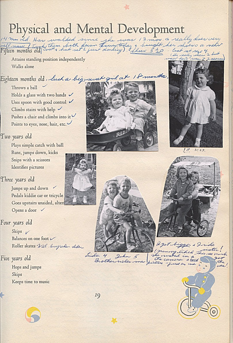 My original birth certificate with my footprints and my mother’s thumb prints is in the front of the book, followed by pages listing my diet, weight and growth.  Here are the pictures and comments my mother wrote: