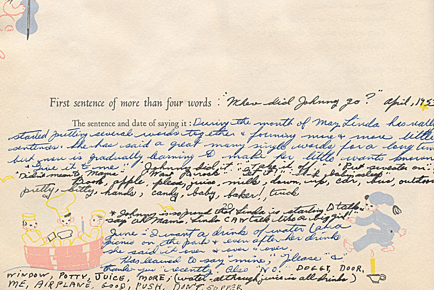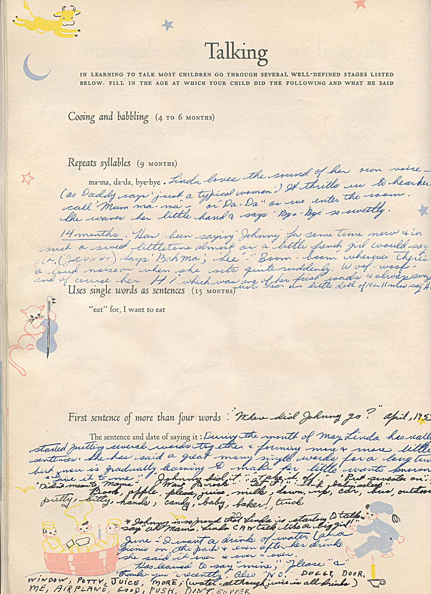 At twenty months: "Where did Johnny go?" At fourteen months, "Boom-boom."